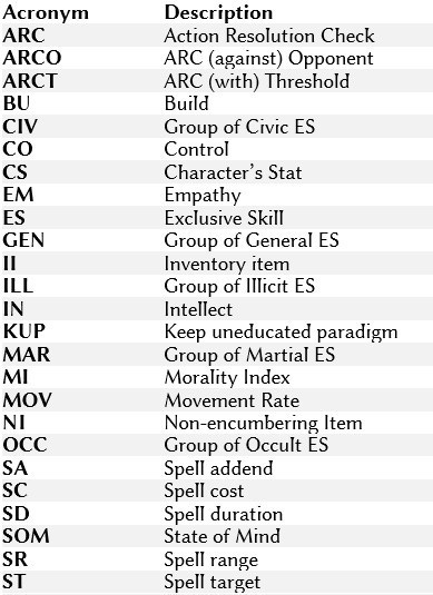 The word malus is used to mean penalty, in order to stay consistent with the opposing term bonus. This book uses the metric system for weights and distances. The table below provides approximate conversions to help readers more familiar with the Imperial (Anglo-Saxon) system. These are simplified estimates meant to ease gameplay, not precise conversions: