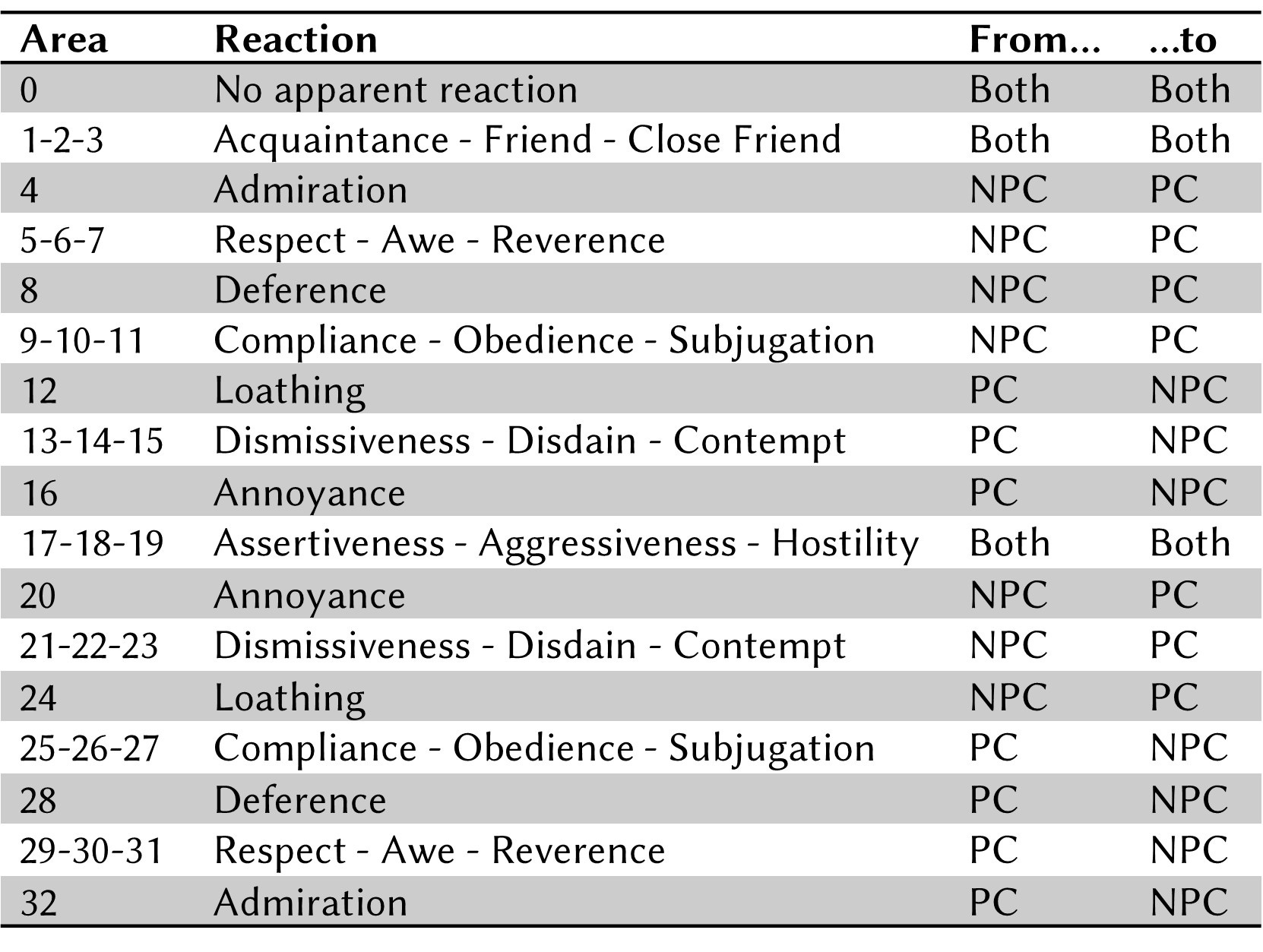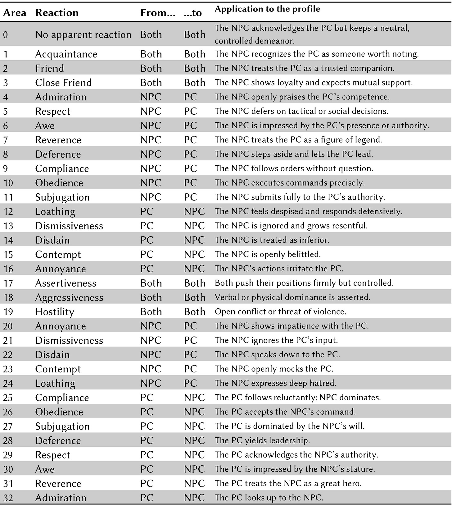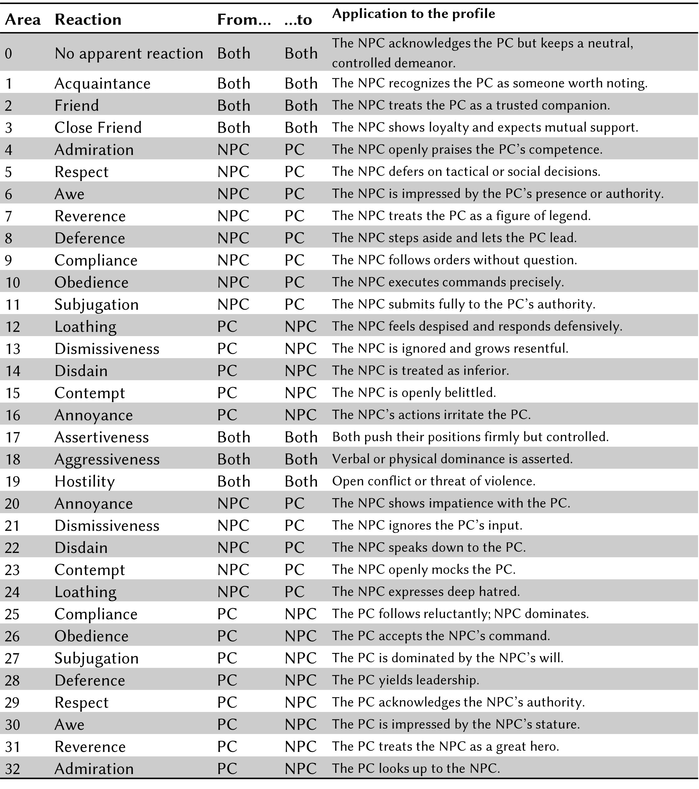 Example for Area 15 (Contempt): “The NPC maintains etiquette while subtly belittling.”