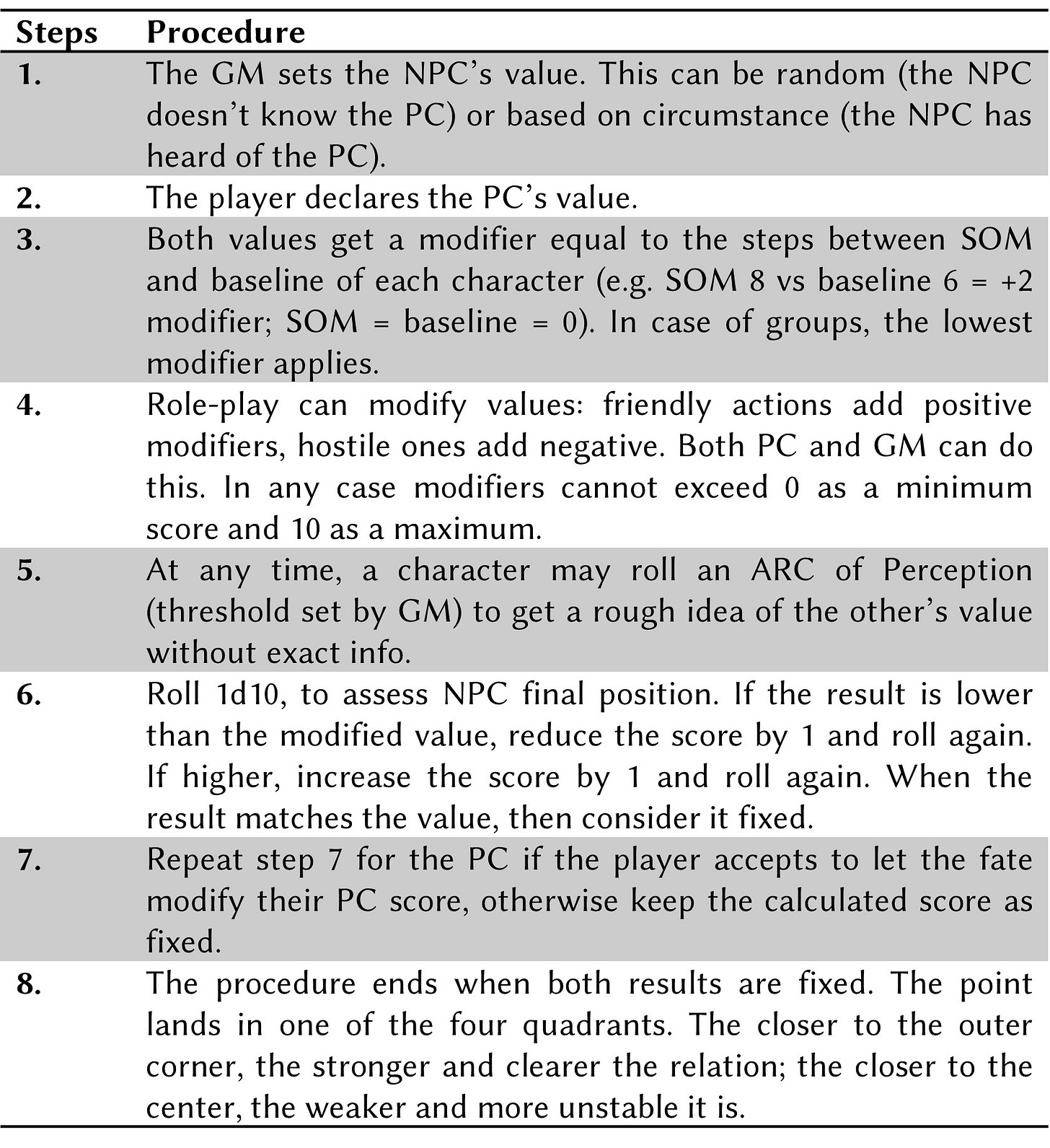 This procedure isn’t strictly necessary, since VI·VIII·X leaves all interpersonal and social relations to pure role-play between players and GM. Still, if the GM wants a dash of randomness in those interactions, this procedure can be applied before starting role-play.